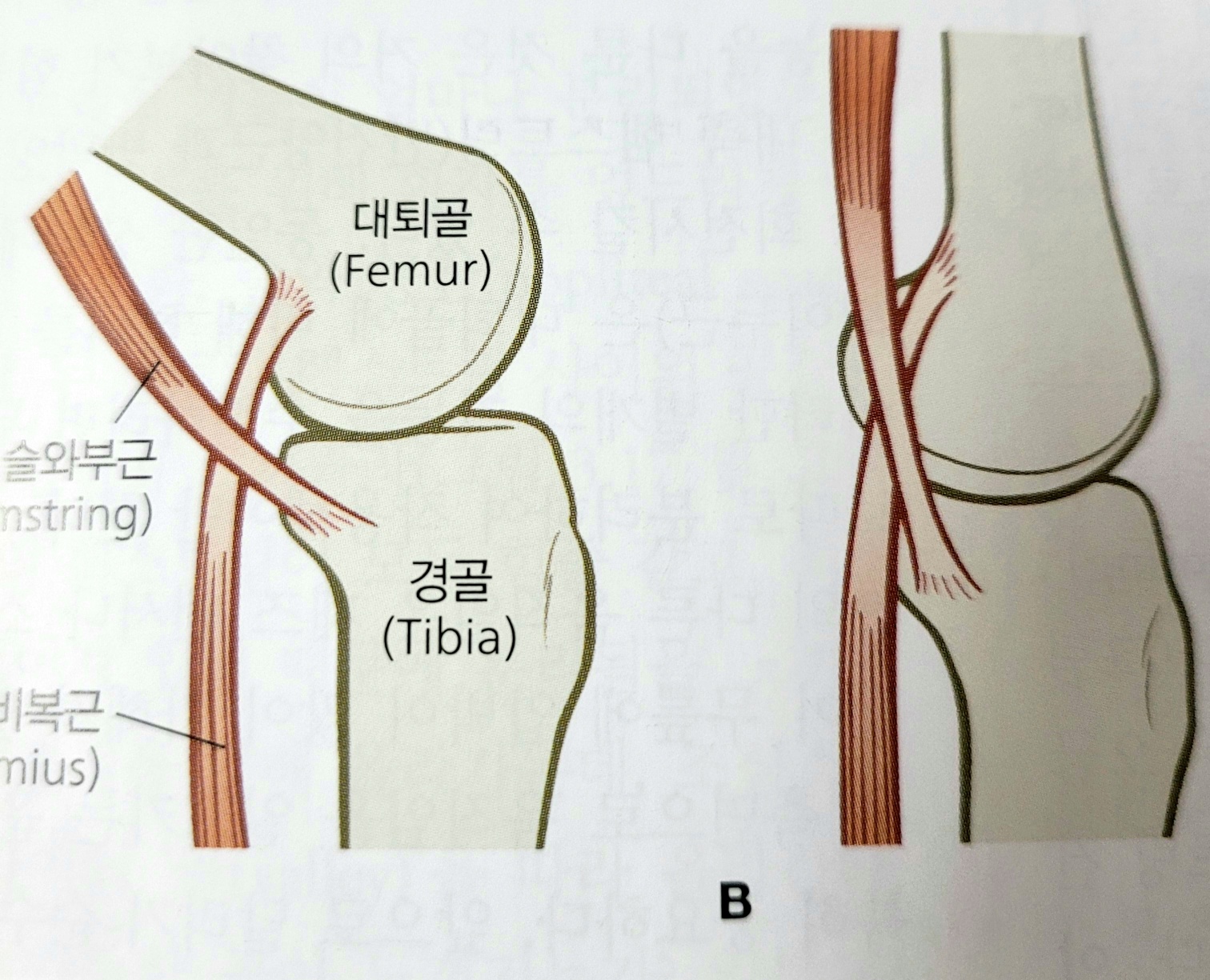 무릎의 기능적 회전은 무릎이 굴곡 되었을 때에만 가능하지만, 대퇴골에 대한 경골의 자세적 내측 또는 외측 회전은 매우 흔한게 발생한다. 비록 발에서부터 올라오는 과긴장과 관절 주변 연부조직 과긴장을 포함한 여러 요인으로 인해 이러한 패턴이 생길지라도, 두 세트의 햄스트링에 각기 다른 작용은 다리를 정렬 상태로 복원시키는 이완에 매우 도움이 될 수 있다. 경골이 내측으로 회전되어있는 경우 내측 햄스트링 세트에 수기 치료 또는 스트레칭이 필요하다. 만약 경골이 외측으로 회전되어 있다면, 대퇴이두근 양쪽 뒤에 치료가 필요하다. 그리고 회전을 감소시키기 위해 회전과 관련 있는 햄스트링에 적절한 시술을 추가로 시행하라. 환자가 스스로 천천히 무릎을 굽혔다 펴게 함으로써 조직의 원심성 신장을 사용하도록 한다. 이러한 회전을 유지하는 조직은 햄스트링 근 근막 안 깊숙한 곳에 있다. 이 방법이 효과가 없다면 발의 위치나 골반의 비틀림 또는 나선선으로 부어 파생할 수 있는 긴장들을 더 기이 살펴볼 필요가 있다. 햄스트링과 계속되는 방향으로 어떠한 근육도 좌골결절에 부착하지 안힉 때문에 근육만 본다면 계속 연결하는 것은 보기 힘들 것이다. 대둔근은 햄스트링의 부착점 위를 지나가고 있으나 분명히 더 표층 근막면을 주행한다. 유사한 근막 면에 있는 대퇴 방형근, 대내 전근, 또는 하쌍자근으로 가는 것은 모두 다 규칙을 위반하는 급격한 방향 전환을 하고 있다. 그러나 근막적으로 생각한다면, 전혀 난처하지 않다. 천결인대는 좌골결절의 후면에서 시작하여 햄스트링의 연장됨이 분명하고 천미 접합부 바로 위 천골의 외측 경계를 가로질러 간다. 천결인대의 하단 끝부분은 햄스트링과 연속된다. 사실 외측 햄스트링의 건은 실질적으로 해부 시 분리할 수 있고 천골까지 이어져 올라간다.